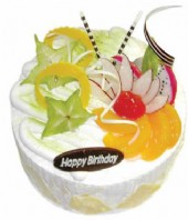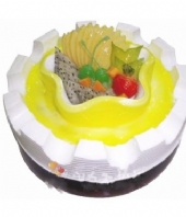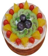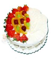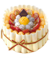 - 8寸鲜奶水果蛋糕,中心放各色时令水果,扇形巧克力插片
