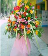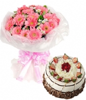 - 【19枝粉色扶郎,白色小菊间插,栀子叶间插】+【8寸鲜奶水果蛋糕】